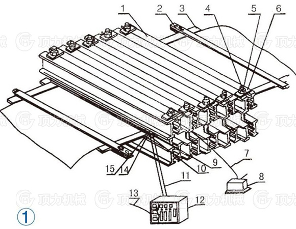 12 電控箱 13. 一次電纜 14 下加熱板 15 水壓板